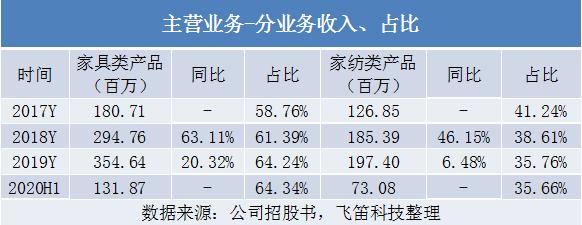 从业务结构看,公司的主营业务分为家具类产品和家纺类产品,其中家具类产品占比较高,且报告期内占比提升,由2017年的59%上升至2020年上半年的64%。家纺类产品的占比呈下降趋势,由2017年的41%降至2020年上半年的36%。