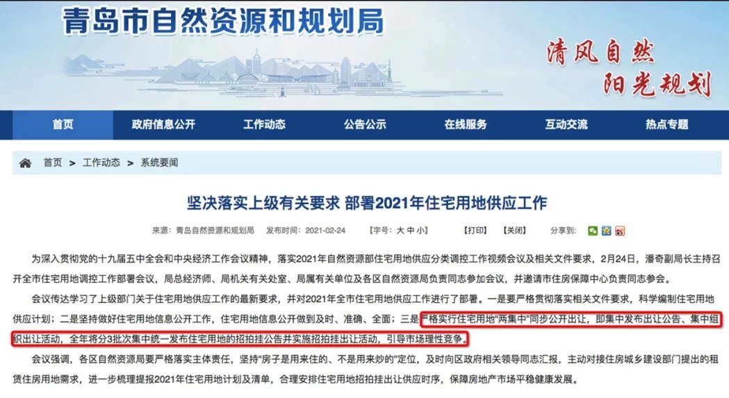 政策方面,为严格落实自然资源部关于2021年住宅用地供应分类调控工作的相关要求,天津、郑州、青岛等纷纷发文实施住宅用地“两集中”同步公开出让,即集中发布出让公告(且2021年发布住宅用地公告不超过3次)、集中组织出让活动。