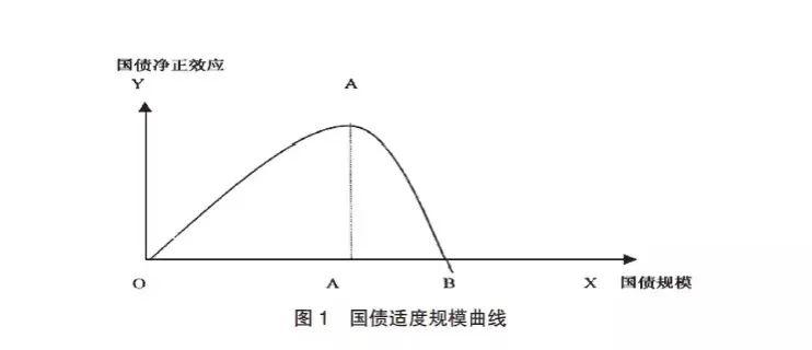 如已有理论研究的国债适度规模问题所指出的,在一定阶段内,国债规模扩张伴随经济社会发展呈现拉动经济的净正效应,而越过一定规模之后将出现反向效应。如下面的国债规模效应关系图所示:在起始原点O上,无国债也无国债作用;在国债规模增长至A点过程中,国债的“净正面效应”开始表现为一条上升的曲线;而后到达一定的临界点,随国债规模继续扩大,其净正面作用开始下降,表现为逐渐加快下滑的曲线;若发行国债的规模大至超过B点,则发行国债将呈现“净负效应”。与拐点相对应的国债规模值A,即为理论上的适度债务规模,过多地超过A点,便有可能出现危机性的后果。