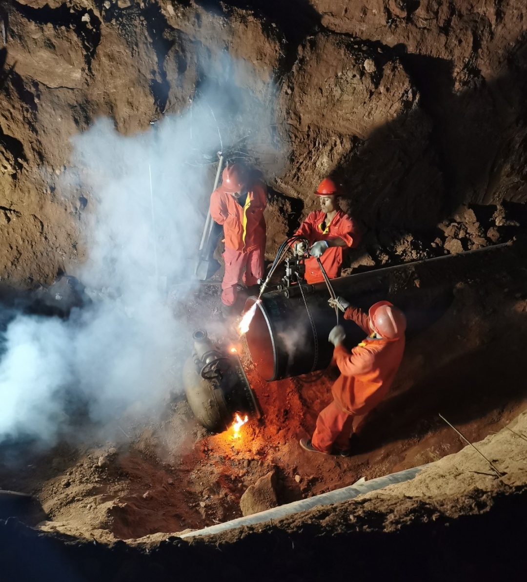 燃气高压分公司运行、检修、工程、安全等相关人员放弃休假,春节期间加班加点,落实各环节工作要求,协调各参建单位,严格把控施工进度。除夕至正月初五完成在役管道降压、置换、工艺交出作业,后进行管道切割、焊接作业。凭着一股牛劲牛力,顺利按期完成连头接驳作业任务,并于正月初九凌晨恢复正常供气。