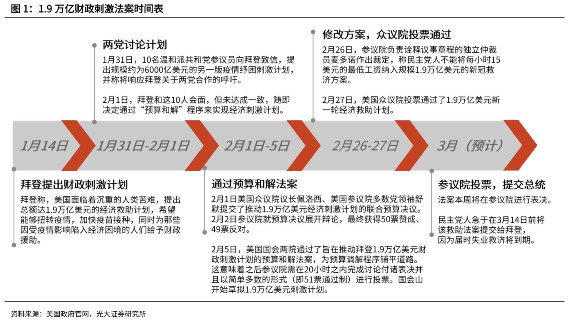 民主党采用预算协调机制通过法案。由于共和党极力反对出台大规模刺激法案,可以通过“冗长辩论(Filibuster)”阻碍法案进展,因此民主党果断使用预算协调(Budget Reconcilation)机制,绕开共和党阻挠,将以简单多数通过方案。美国众议院已于2月27日投票通过法案,意味着只要再闯过参议院,此法案将正式生效。3月1日,参议院民主党领袖舒默表示,参议院将于本周开始就此提案进行辩论。