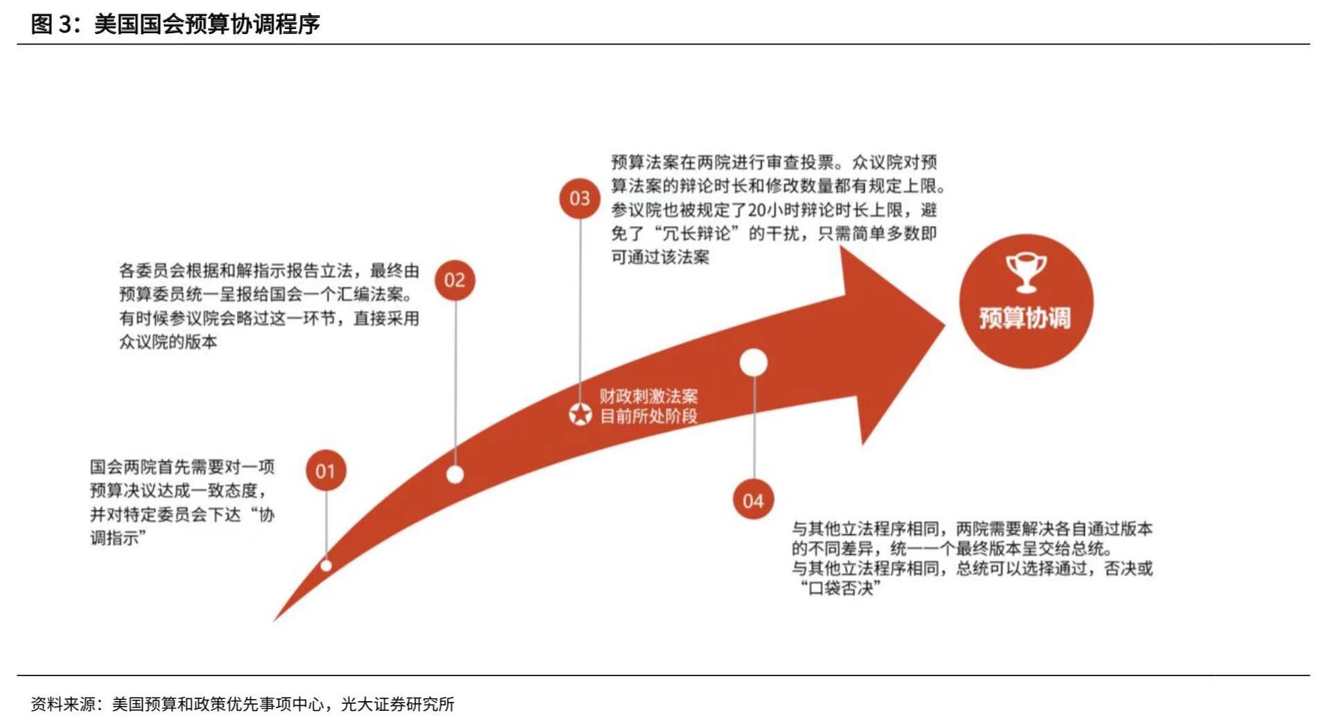 目前众议院已表决通过财政刺激法案,根据美国国会立法程序,接下来需参议院投票。而预算协调机制是一个可选的加速立法程序,能够帮助该法案绕过冗长辩论而直接以简单多数的形式进行投票。