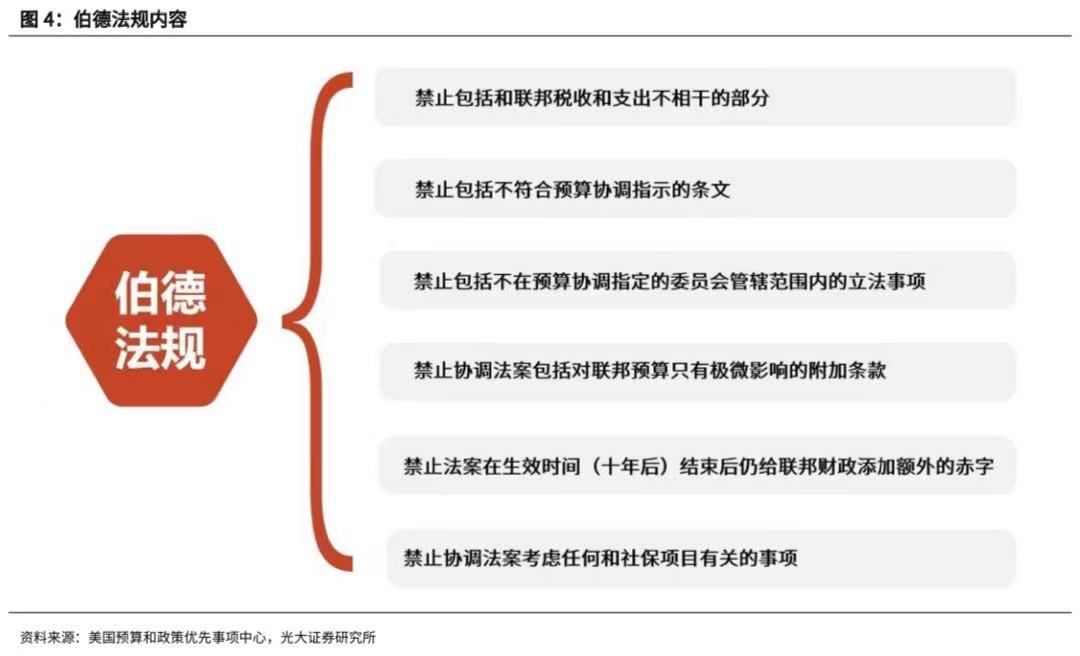 在预算决议中,任何一项拨款都需要受到“伯德法规”检视,用以制衡“协调法案”的权力。该法规由已故参议员罗伯特伯德在1985年提出,该法规要求预算法案中的所有规定都由财政收入支持,不能在10年的预算期以后增加赤字。具体内容见图4。