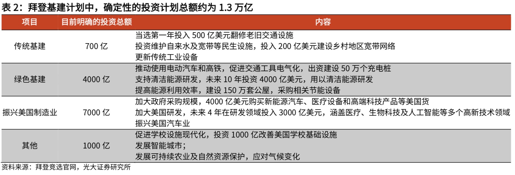 基建投资计划成为下一阶段焦点。随着财政刺激法案逐步落地,拜登重心或转向基建计划。基建计划总体包括公路桥梁等传统基建,清洁能源、电动汽车为主的绿色基建,振兴美国制造业计划,以及促进学校现代化、推动智慧城市建设等。其中,较为确定性的投资计划约为1.3万亿美元,横跨未来10年。