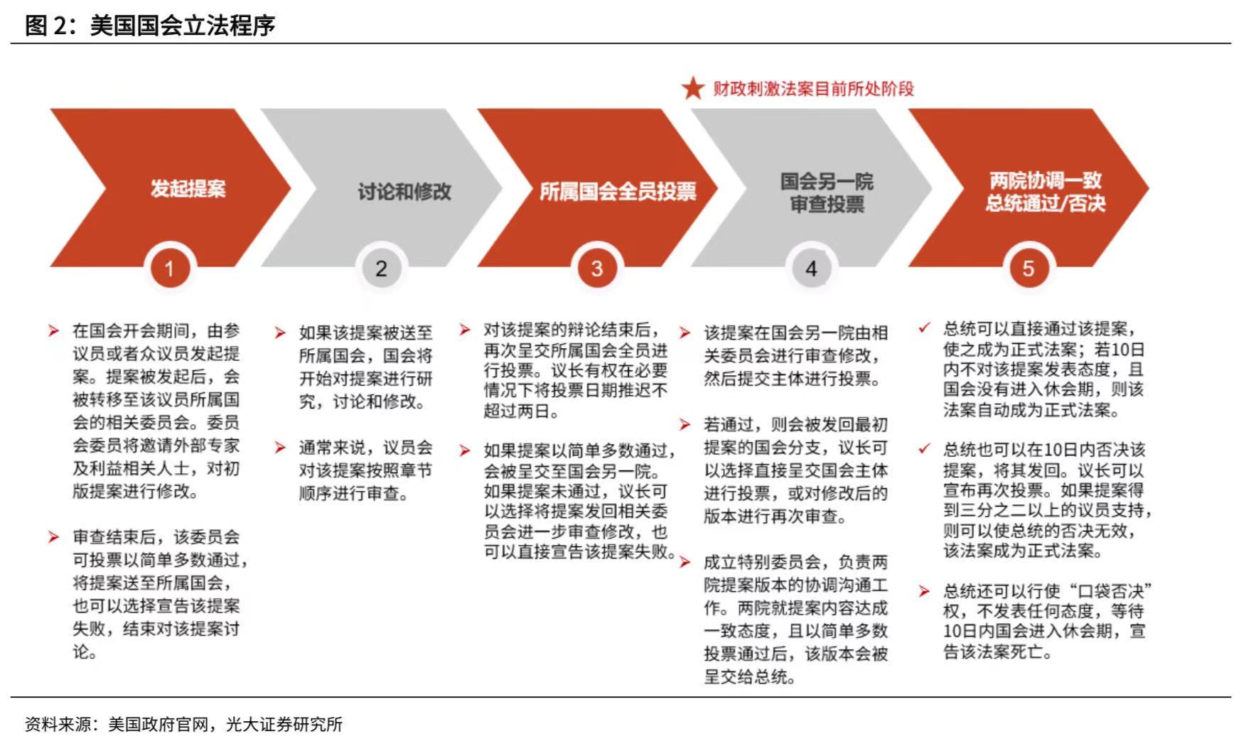 财政刺激的最终落地和基建计划的推进都有赖于美国的国会立法通过,为此我们整理了美国国会立法和预算协调机制,用以说明两项计划落地的可能性和预期时间。