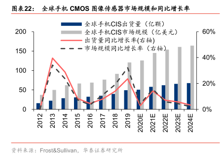 智能手机镜头多元化正在推动多摄升级,并进一步带动CIS需求的增长。Frost&Sullivan统计显示,智能手机平均摄像头数量已经由2015年的2.0颗增加至2019年的3.4颗,至2024年将进一步增加为4.9颗。同时,2024年全球手机CIS出货量和市场规模将分别达到67.8亿颗和164.1亿美元,2019年同期为49.3亿颗和120.8亿美元,增长幅度超过40%。
