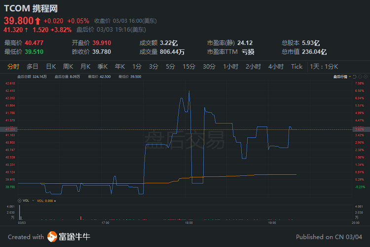 携程盘后上涨近4%。