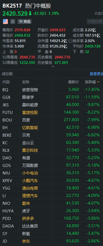 大型中概股方面,阿里巴巴涨0.79%,京东跌2.86%,拼多多跌3.86%,唯品会涨3.22%,哔哩哔哩涨0.61%,百度跌7.99%,网易跌2.63%,爱奇艺涨1.77%,腾讯音乐涨0.18%,微博跌2.10%。