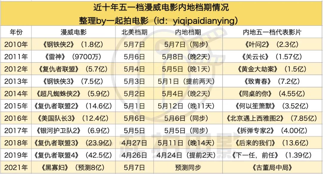 唯一的特例出现在2019年的《复联4》,因为国产片的持续匮乏,五一档并没有任何一部中等体量以上国产片定档,因此《复联4》也获得了提前北美上映的待遇。