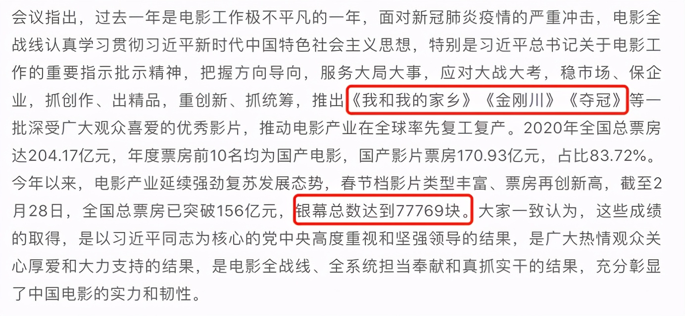 首先,会议对2020年做了一个总结。面对新冠肺炎疫情地严重冲击,中国电影市场受到重创。