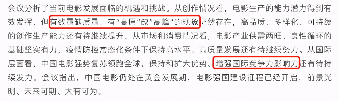除了庆祝中国电影复工以来的胜利,电影局也总结了目前内地电影市场存在的问题。这里提到了【有数量缺质量、有“高原”缺“高峰”的现象】。“有数量缺质量”,意思是目前中国有着年产近千部电影的能力,然而平均质量却较低,每年票房破亿的国产片也仅仅只有40-50部,不足年产量的10%;而“有高原缺高峰”的现象,或许也是目前高层对内地影史票房纪录连续四年没有被打破的现状地不满——从2014年到2017年,内地影史票房纪录被连续多次刷新,然而距离2017年暑期档《战狼2》56亿的票房纪录已经过去四年,短期内依然没有任何影片具有可以超过《战狼2》的可能,对于想要创造更高票房大盘的中国电影市场或许并不是一个好消息。