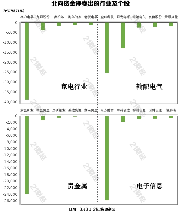 北向资金减持了19个行业,其中家电行业最多,净卖出金额达3.54亿元,其次是输配电气行业,净卖出2.53亿元。