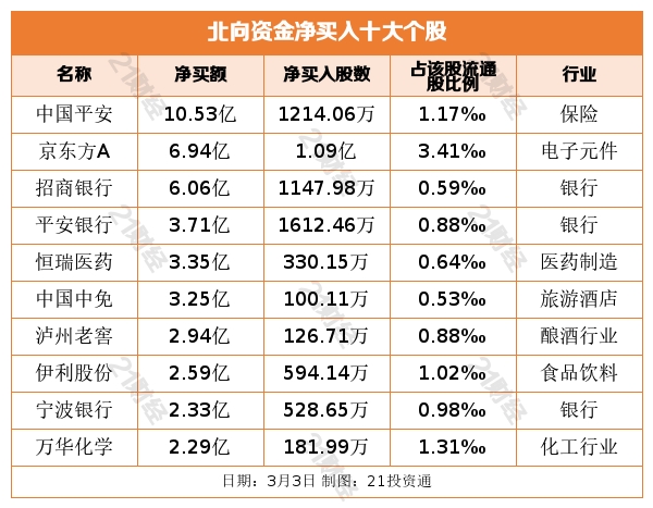 个股方面,北向资金净买入中国平安(601318.SH)、京东方A(000725.SZ)、招商银行(600036.SH)、平安银行(000001.SZ)、恒瑞医药(600276.SH)居前,其中,中国平安被净买入10.53亿元,京东方A被净买入6.94亿元,招商银行被净买入6.06亿元,平安银行被净买入3.71亿元,恒瑞医药被净买入3.35亿元。