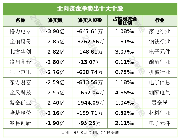北向资金净卖出格力电器(000651.SZ)、宝钢股份(600019.SH)、北方华创(002371.SZ)、贵州茅台(600519.SH)、三一重工(600031.SH)居前,其中,格力电器被净卖出3.90亿元,宝钢股份被净卖出2.85亿元,北方华创被净卖出2.82亿元,贵州茅台被净卖出2.80亿元,三一重工被净卖出2.76亿元。