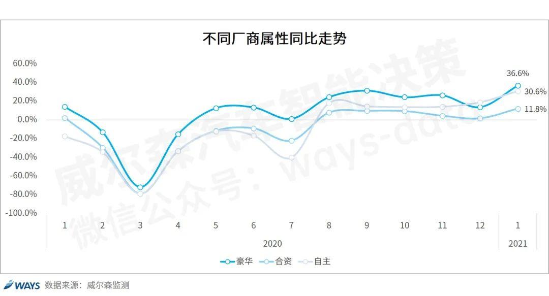 豪华市场零售回归高增长的轨道:豪华品牌1月份额从20年12月的13.9%快速回升至16.7%,对比去年同期,份额上升1.8%,同比增长36.6%。消费升级的高端增换购的需求依然旺盛,2020年年末部分豪华品牌由于供给问题造成的影响已得到缓解,豪华市场零售回归高增长的轨道。