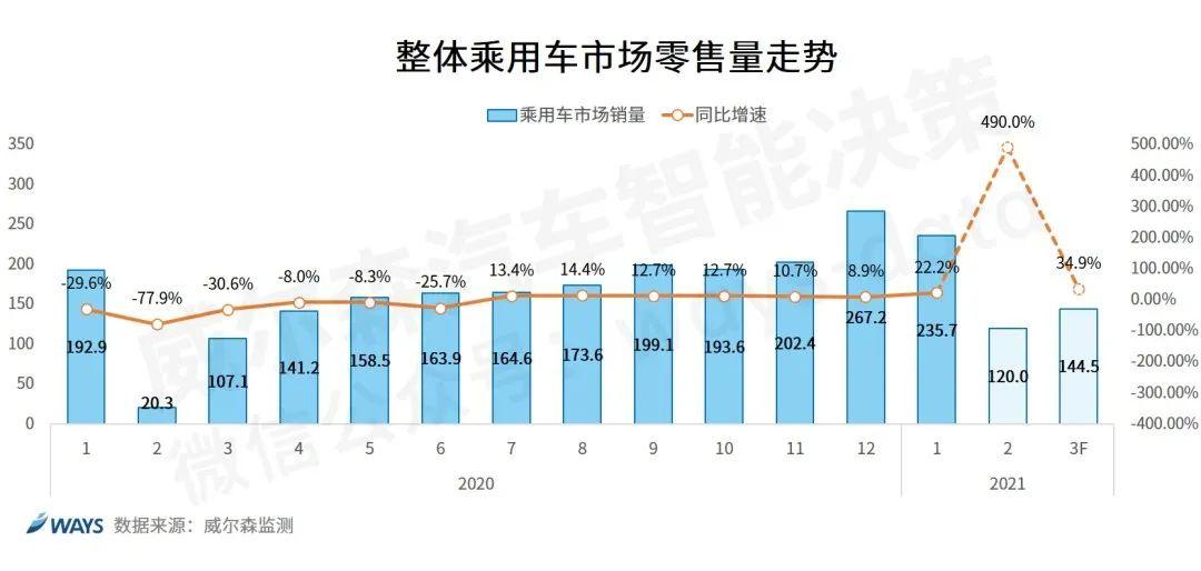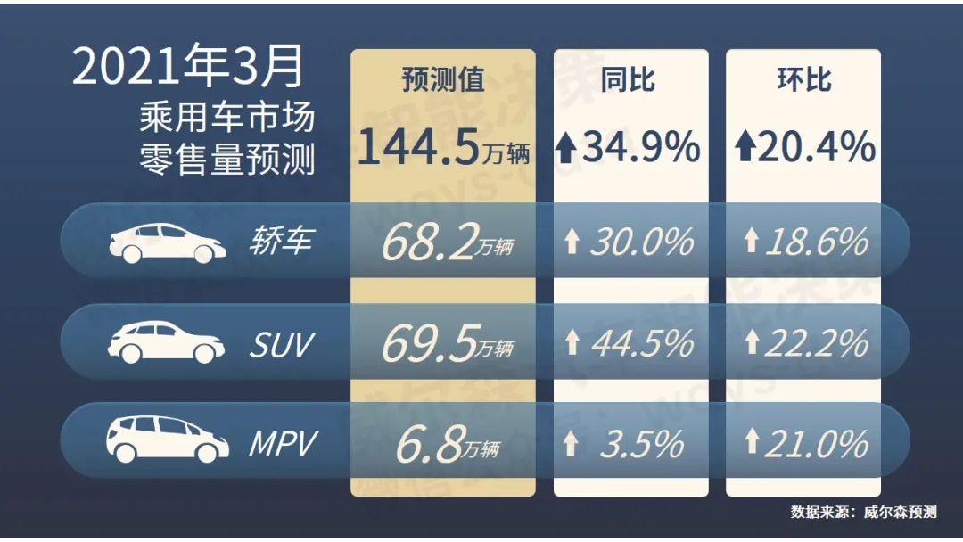 根据威尔森预测,2021年3月乘用车市场预测零售量为144.5万辆,同比上升34.9%,环比上升20.4%。
