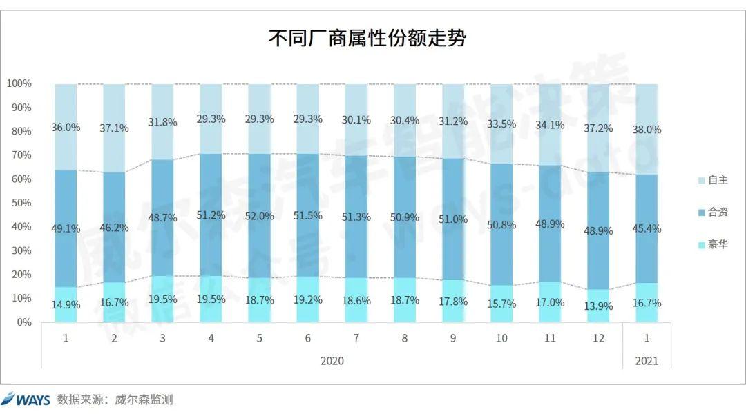 2021年1月自主品牌延续强势表现:份额上升至38.0%,高于去年同期2.0%;同比增长30.6%,A00纯电市场继续走强的驱动功不可没;吉利、长安、长城等主力厂商表现持续向好,支撑自主市场上升。此外,红旗、蔚来在消费升级的利好下,也实现同比高增长。