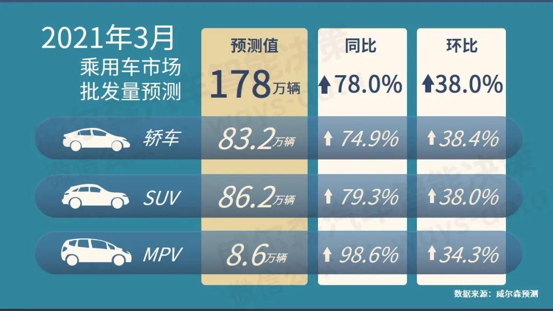 根据威尔森预测,2021年3月整体乘用车市场批发量预计为:178万辆,同比2020年3月上升78.0%。