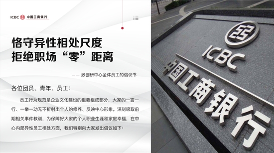 网络上流传的一份中国工商银行网络金融部创新研发中心团支部发布的致该中心全体员工倡议书——《恪守异性相处尺度 拒绝职场“零”距离》表示,员工行为规范是企业文化建设的重要组成部分,大家的一言一行、一举一动无不折射出个人的修养、反映中心形象。深刻吸取相关事件教训,为保障好大家的个人职业生涯和家庭幸福,在中心内部异性员工相处方面,我们特别向大家发出倡议。