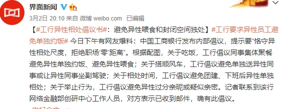 3月2日晚间,“工行要求异性员工避免单独约饭”冲上微博热搜引起网友广泛讨论。