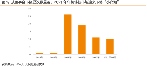 截至2020年3月3日收盘,据Wind统计已有157只标的触发下修条款,2021年前2个月公告转债下修提议的数量已接近去年全年。市场对于部分具有潜在下修可能的转债关注度有所提升。由于17年转债发行提速、多数转债计息期为5-6年,若正股市场延续调整趋势,更多转债可能公告下修。历史数据表明,董事会提议下修后转债相对于正股的平均相对涨幅高于3%,本文将对历史转债下修情况进行简要讨论,同时结合之前下修到位案例的特征,找到目前具有潜在下修可能的相关标的。