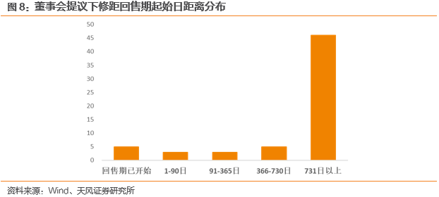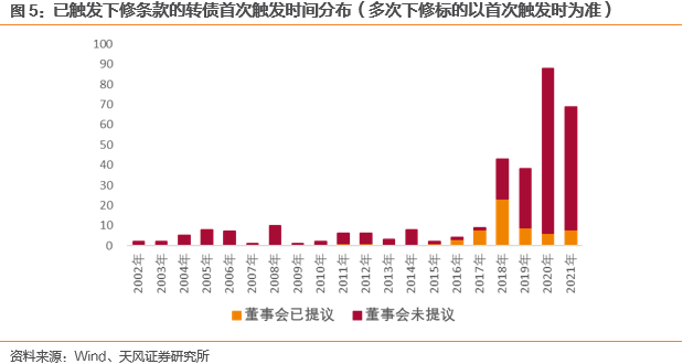 进入转股期后,董事会提议积极性可能提升。若将下修触发重新定义为已进入转股期,且满足条款要求,则董事会在条款触发7日内提出议案的案例个数将由18个增至30个,其中22个案例中董事会在转股期到来前即提议;触发90日以后董事会再提议的案例数将由35个降至23个。