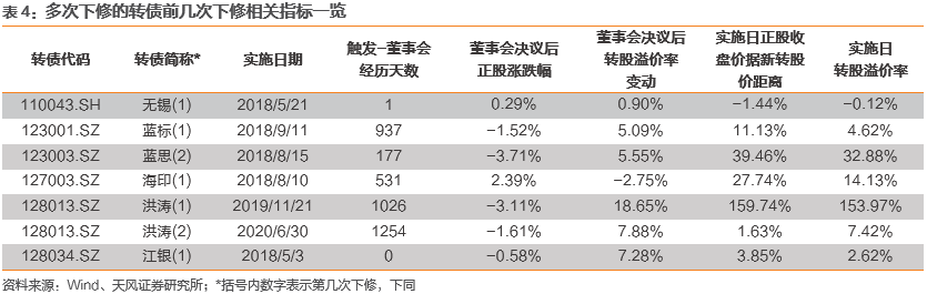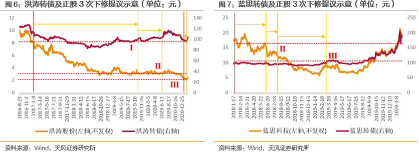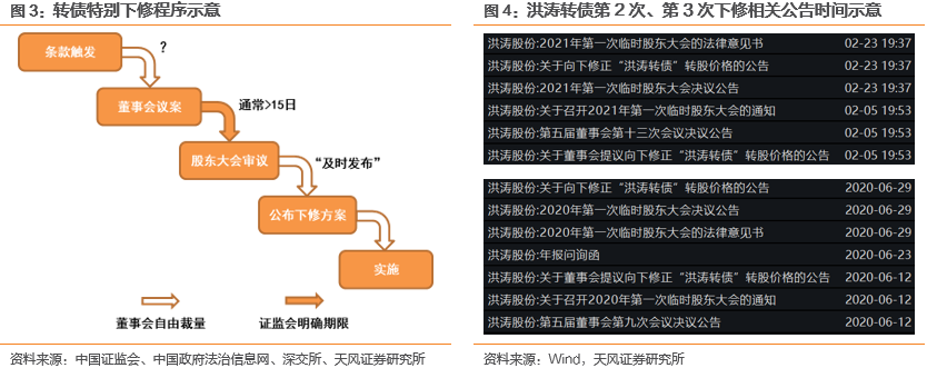 发行人的下修意愿可以从在触发下修条款后董事会提议是否较快和下修幅度是否到位(即下修是否成功)两个层面分析,我们后续以下修3次的洪涛、蓝思为例进行具体分析。