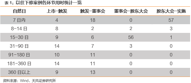 汇总来看,历史数据表明:(1)下修条款触发时间比较分散,少数转债刚上市不久即触发;(2)董事会提出下修议案的时间呈两极化,18个案例在触发条款后7日内董事会提出议案,35个案例在触发的至少90日后才提出议案,其中13个案例的提出时间迟于1年以上,反映不同公司下修迫切程度的差异;(3)由于法律法规对股东大会召开时间有相应规定,绝大多数股东大会在15-30日内召开,确定性较高;(4)股东大会审议并公布最终方案后,下修实施大多发生在1周内,最晚的案例不超过1个月。