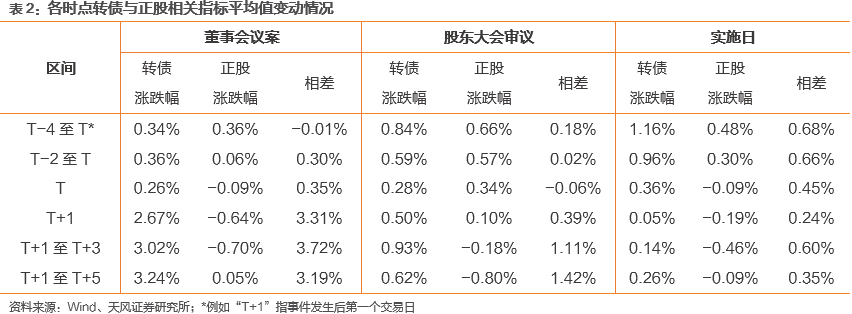 我们考察了不同时点转债及正股平均表现。数据表明:(1)董事会提议下修时转债平均涨幅最大:董事会提议下修后第1、1-3、1-5个交易日区间,转债平均涨幅分别为2.67%、3.02%和3.24%,而公告前1、1-3、1-5个交易日区间内均价变动不超过0.5%;(2)董事会公告下修可能对正股造成一定短期负面影响,原因是主要是转债对正股潜在稀释压力增大;同时可能表明管理层对于公司股价短期内快速上涨的信心不足。公告后首个交易日正股平均下跌0.64%,但至第5交易日左右基本恢复至原水平;(3)股东大会审议日与实施日前后转债平均涨幅并不很高,一方面可能是部分案例下修不到位使转债价格回落,另一方面可能由于董事会提案后转债已明显上涨,透支了后续上涨空间。