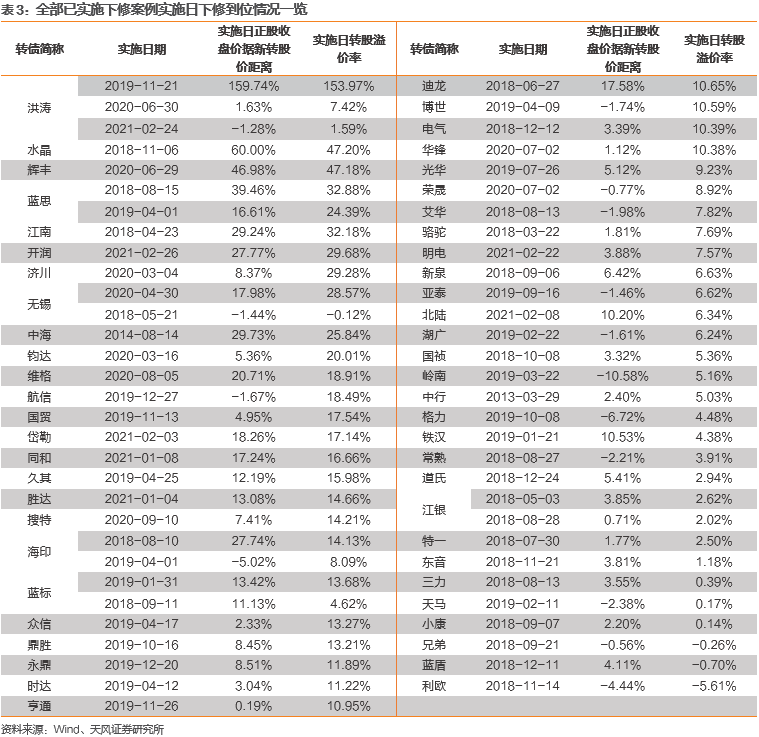 多次下修方面涉及6只转债,其中洪涛2021年前下修两次,2021年2月24日实施第三次;蓝思于2018年6月8日曾提议下修,但遭股东大会否决,随后成功实施2次下修;海印、江银、蓝标、无锡各实施2次下修。数据表明多次下修案例中,前几次下修未必完全失败,例如无锡、蓝标、洪涛(2,*括号内数字表示第几次下修)、江银的个别下修幅度均到位,主要是后续正股价格进一步下降,导致出现再次下修的必要;而对洪涛(1)、海印下修后转股溢价率依然高企的案例,基本可以认为下修“不到位”。