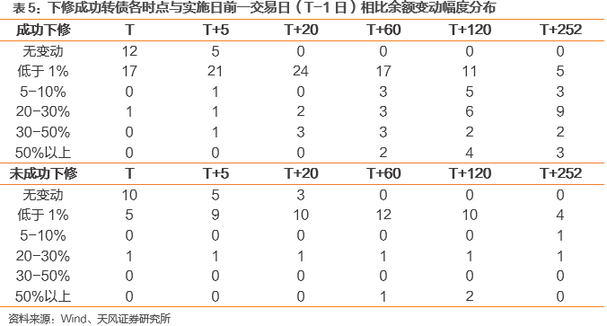 转债余额方面,我们在各个时点剔除未进入转股期、已退市等不合要求的案例,以实施日转股溢价率是否低于15%区分是否成功下修,发现实施日后20个交易日内绝大多数转债转股规模降幅小于1%,实施日当天近半数转债未出现转股;随后,成功下修的转债规模逐步下降,未成功下修的转债规模依然无明显回落。两组对比表明以转股溢价率等指标区分下修成败是相对有效的。