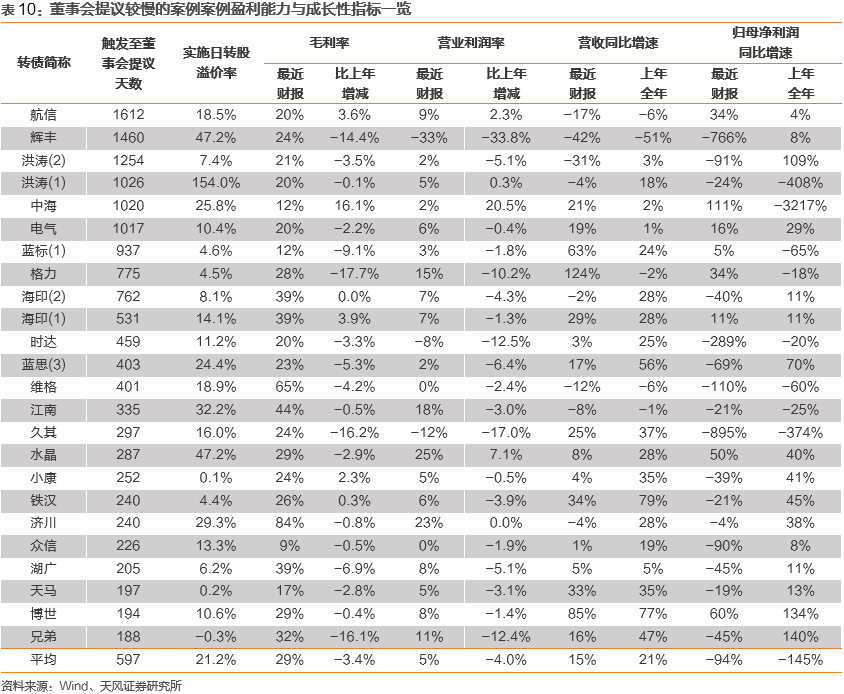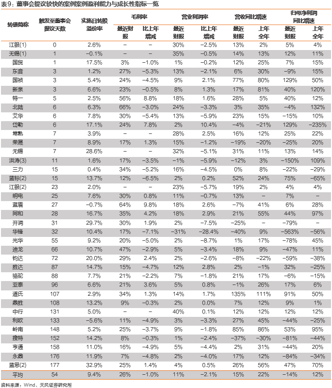 下表列示董事会提议较快一组的相关盈利能力和成长性指标。“最近财报”仍指董事会提议日前最近一期财报数据;“上年全年”则指董事会提议日期上一年年度报告,如若董事会于2020年6月10日提议下修,则上年全年财报对应时点为2019年12月31日。对于2021年的新案例,我们选用2020年前三季度报告和2019年年度报告。