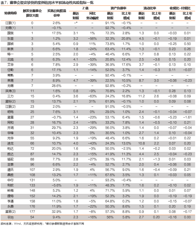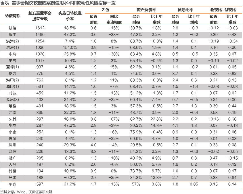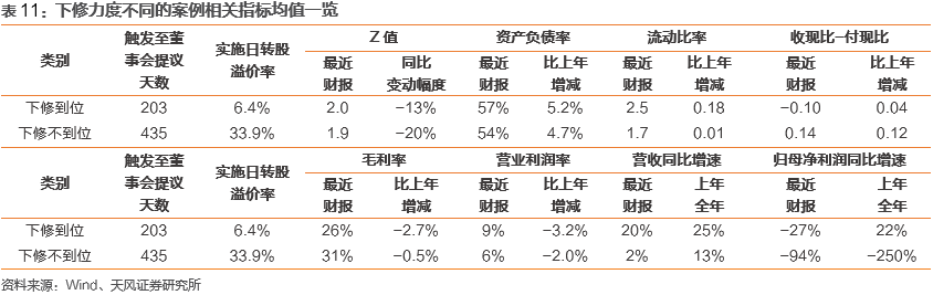 在董事会提议下修当期,较快提议下修的一组往往经历更明显的信用质量和流动性恶化,这是由于发行人偿债能力越弱,推动下修的意愿越强:(1)下修较快和较慢两组的负债率水平相对接近,但下修较快一组的平均增速相对高2个百分点,说明其长期偿债能力恶化速度更快;(2)下修较快一组的平均流动比率更高且增速更快,但现金流状况不佳,体现其当期流动资产较难转化为现金流,或付款压力有所提升;(3)综合来看,下修较快案例的平均Z值(=1.2*营运资本/总资产+1.4*留存收益/总资产+3.3*息税前利润/总资产+0.6*总市值/总负债+0.999*营业收入/总资产)更高,但相比上年同期也是恶化更快。