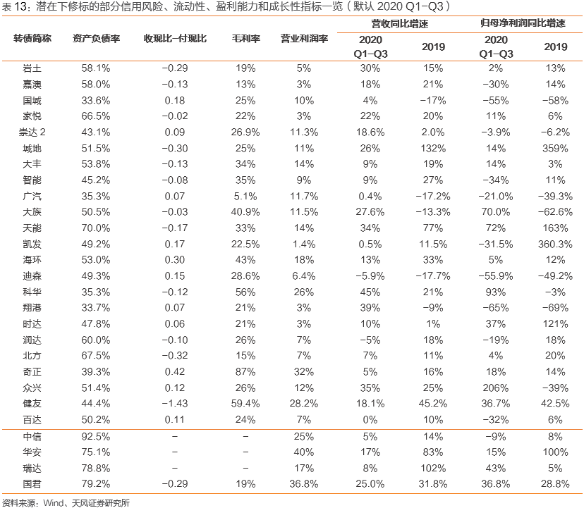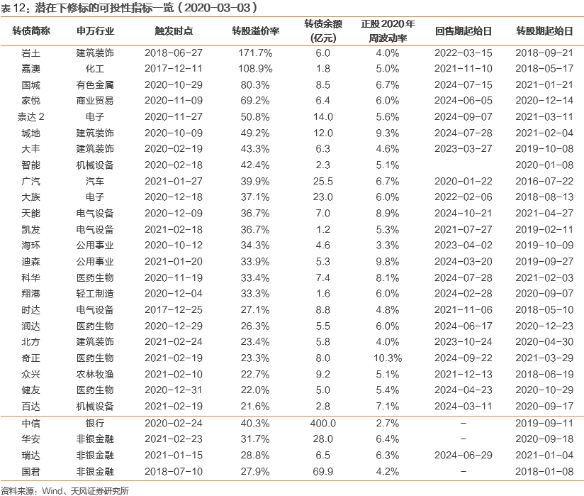 截至2020年3月3日,近期无强赎、未退市转债合计336只,我们剔除转股溢价率低于20%、目前不太可能下修的标的后,合计约114只转债目前或一段时期前曾触发下修条款。结合上述分析结论,我们进一步的筛选条件包括(1)2020年12月前上市(否则存续期过短,董事会一般不下修)、(2)2020年前三季度资产负债率和收现比与付现比之差比上年同期下降(偿债能力与流动性下降)、(3)营收不低于上年同期的90%(依然具备一定成长性);此外,我们还考虑了部分公司股价较低,可能受条款中规定转股价不低于每股净资产或每股面值的要求影响(即以下修后转股价计算的PB不低于1)。