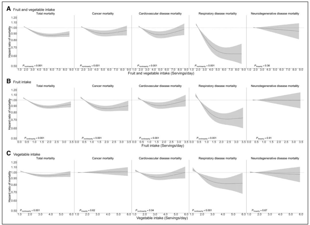 在调整了已知和疑似混杂变量和风险因素后,研究人员观察到水果和蔬菜摄入量与总死亡率和癌症、心血管疾病和呼吸系统疾病导致的特定病因死亡率的非线性反向关系。