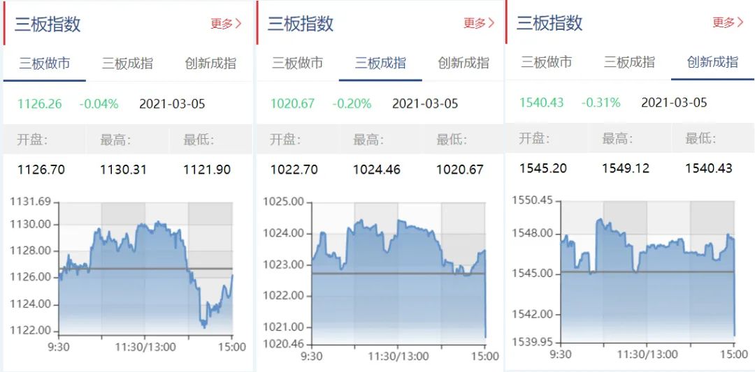 截至3月5日收盘,三板做市报1126.26点,下跌0.04%;三板成指报1020.67点,下跌0.20%;三板创新成指报1540.43点,下跌0.31%。