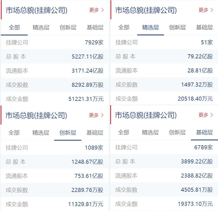 新三板挂牌公司总计7929家(精选层51家,创新层1089家,基础层6789家),总股本5227.11亿股,流通股本3171.24亿股。
