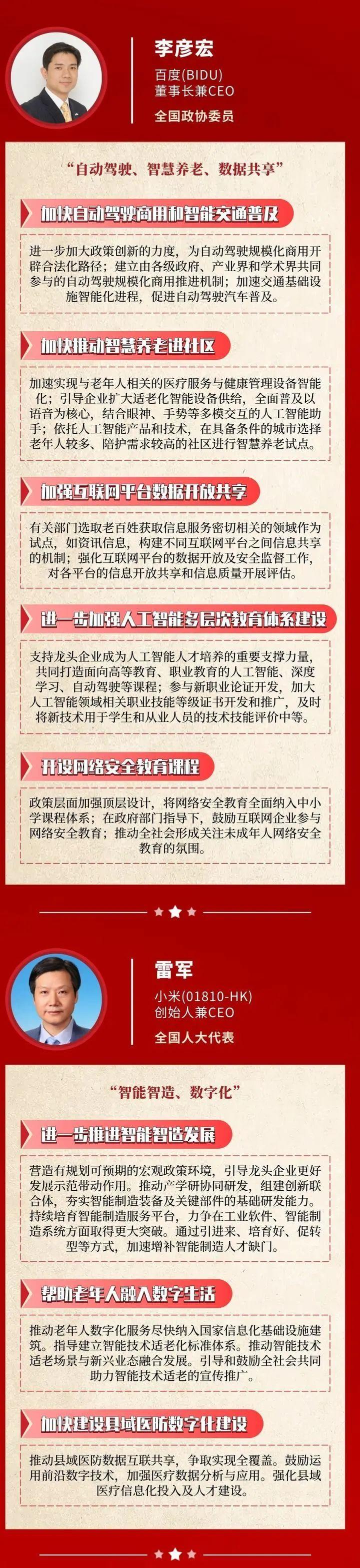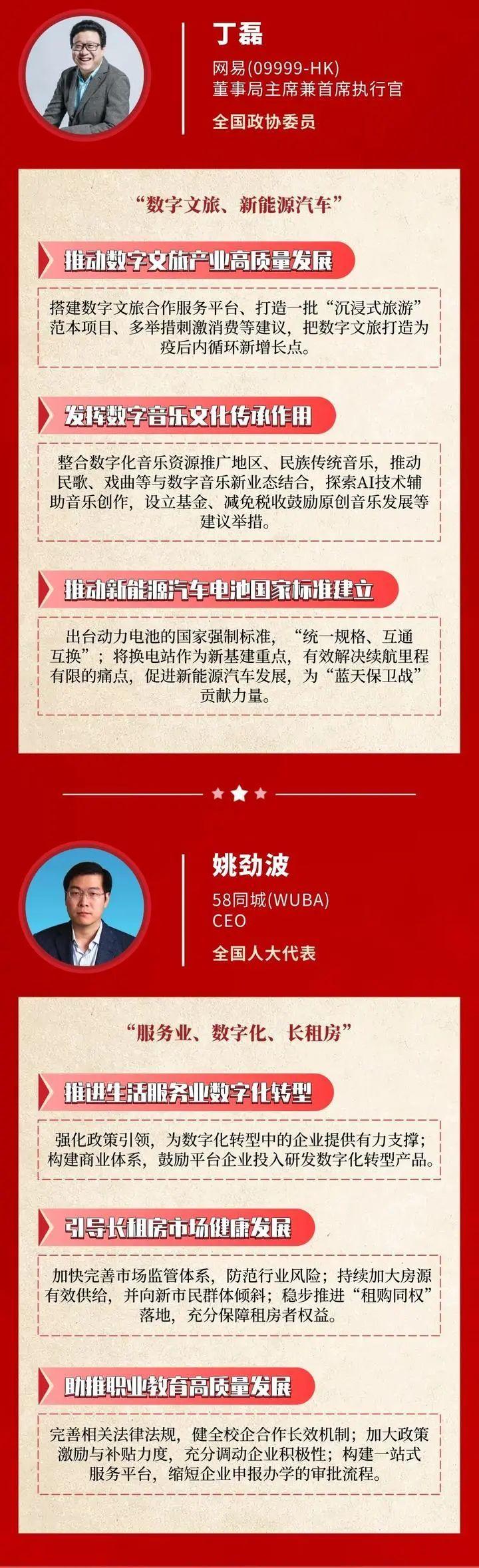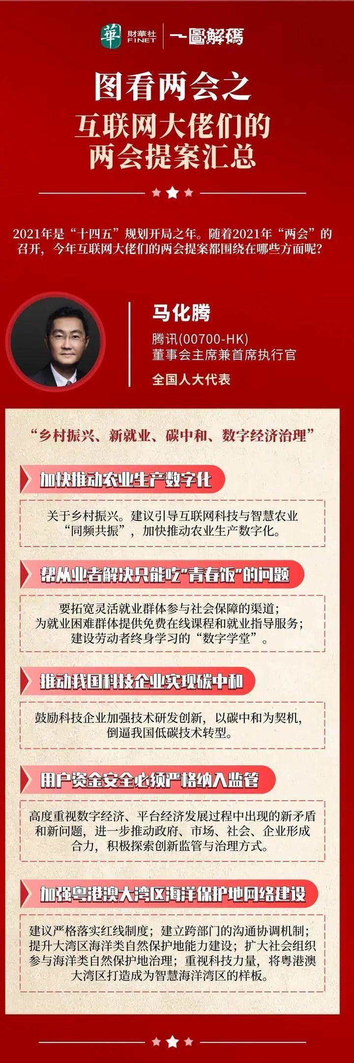 2021年是“十四五”规划开局之年。随着2021年“两会”的召开,今年互联网大佬们的两会提案也引发了热议。其中,格力电器董事长董明珠建议提高个税起征点至1万元及推行“中国标准”;腾讯董事会主席兼首席执行官马化腾则聚焦在乡村振兴、新就业、碳中和、数字经济治理等方面。