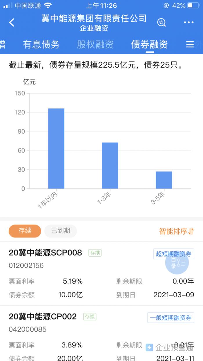 企业 预警通数据显示,目前其存续债券数量25只,存量规模225.5亿,接下来到期的债券为“20冀中能源SCP008”、“20冀中能源CP002”,分别将于3月9日、3月11日到期,到期规模分别为10亿、20亿。市场也高度关注两只债券的兑付情况。