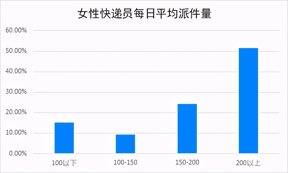 像@西西这样的女快递员还有很多,快递100的调研数据也显示,51.52%女性快递员日平均派件量在200单以上,23.24%的人在150至200件之间。另外从男性快递员的调查数据中发现,66.17%的男快递员表示女快递员月工资与自己差不多。