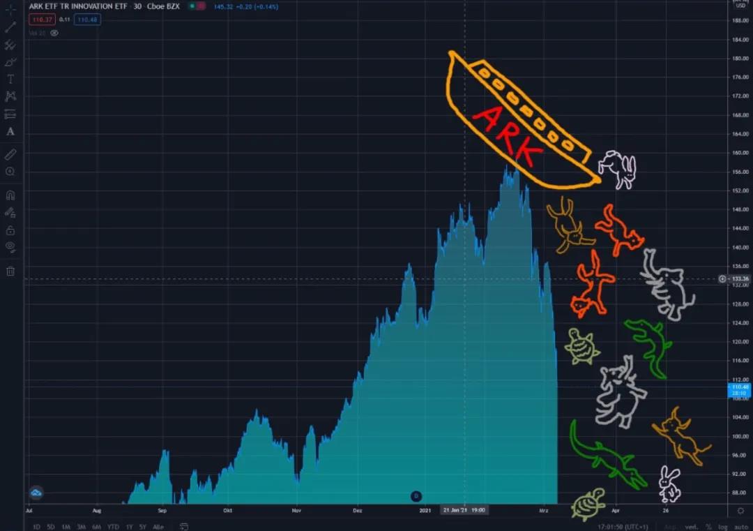 波澜壮阔杀估值的一周,三大股指基本没跌,即使最弱的纳指也就跌了2%,但特斯拉和木头姐却成为了华尔街最大的狙击对象,ARK的成分股远远跑输了大盘,完美印证了我上周末的判断。