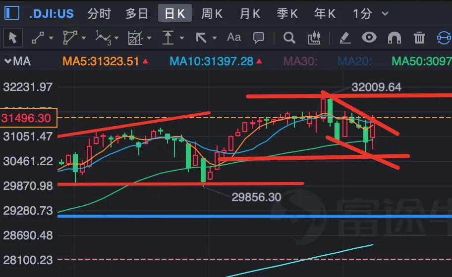 关键就是看周二周三的时候,道指能不能突破32000,要是突破这个阻力线,那皆大欢喜,美股这一波调整已经结束。假如没能突破32000,说明阻力线有效,那道指肯定就要往下跌,技术形态就要形成双顶。道指一旦补跌,那纳指和标普必然会受到前期阻力线的压制,大盘一定就会再次下跌。
