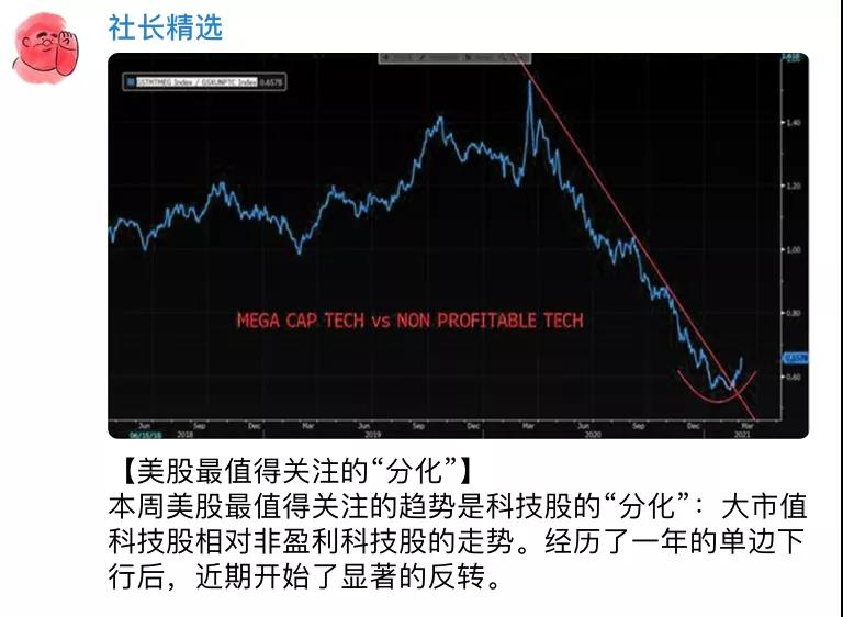 周末的时候,我在群里面分享了一个非常重要的信息。那就美股科技股出现了一个非常值得关注的分化:大市值科技股相对非盈利科技股的走势,经历了一年的单边下行后,近期开始了显著的反转。上面这张图应该是接下来的投资主线,大家一定要重视这种大趋势的反转。未来我们投资科技股的时候,是不是应该更加关注盈利能力,而不是一味单纯的增长。