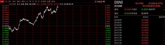 美债收益率上升同时,美元指数也在节节攀升,目前已经突破92点,最高达到92.303点,相比今年1月初最低的89.191点,上涨3.5%。