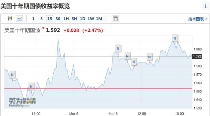 受此影响,10年期美国国债收益率连续两天暴涨,今年触及1.626%的高点,目前回落至1.592%。