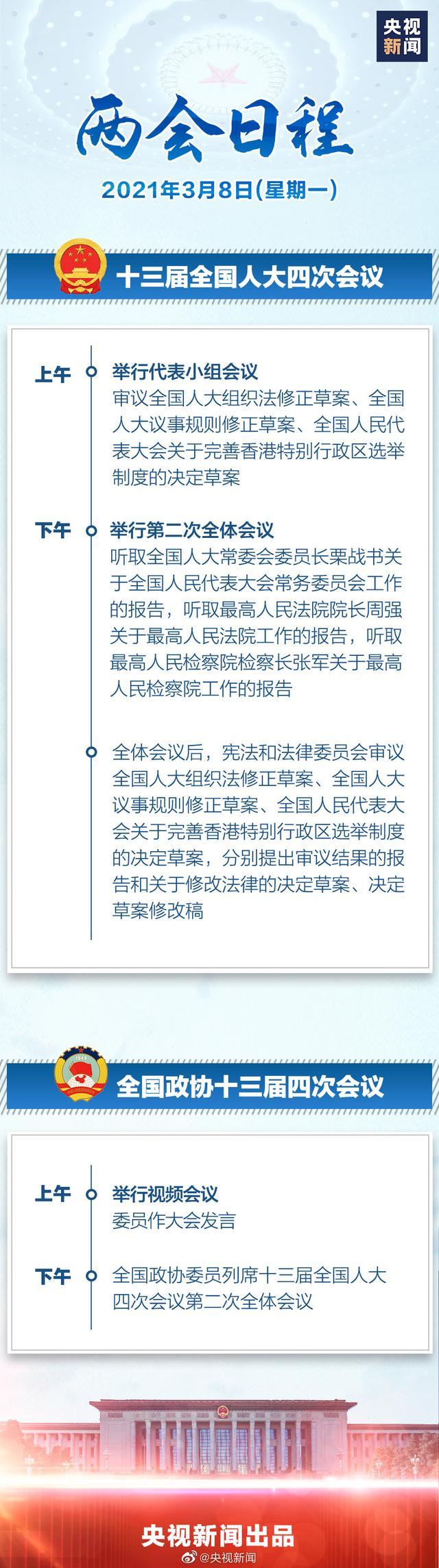 3月8日两会日程:全国人大四次会议第二次全体会议今日举行