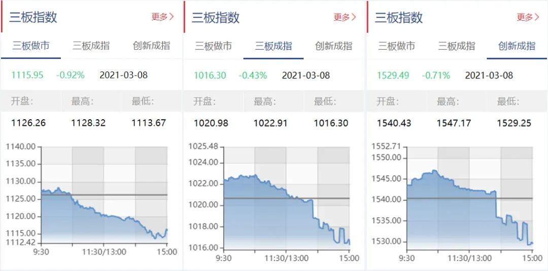 截至3月8日收盘,三板做市报1115.95点,下跌0.92%;三板成指报1016.30点,下跌0.43%;三板创新成指报1529.49点,下跌0.71%。