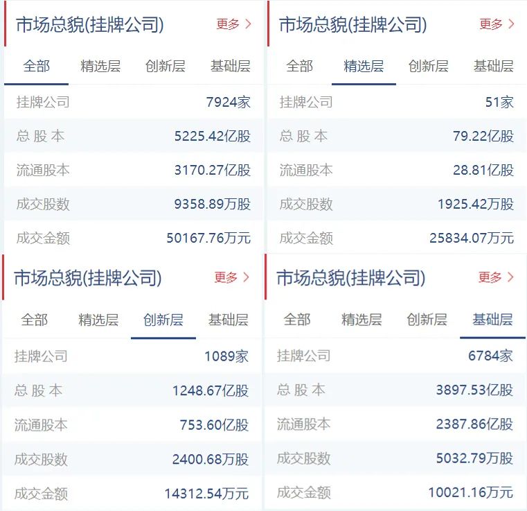 新三板挂牌公司总计7924家(精选层51家,创新层1089家,基础层6784家),总股本5225.42亿股,流通股本3170.27亿股。