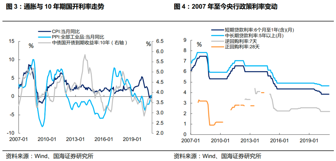 2016 年至 2017 年,本轮通胀上行周期中 PPI 与 CPI 表现分化。其中 PPI 由 2015年底-5.9%快速上行至 2017 年 2 月份 7.8%,并在 2017 年 2、3 季度磨顶;而同期 CPI 则受猪价下行的影响,围绕 2%左右波动。通胀上行期间,央行出于金融去杠杆的考量,于 2017 年至 2018 年一季度提高逆回购利率 30BP。10 年期国开利率则于 2018 年一季度见顶。值得注意的是,尽管 PPI 增速已经于 2017年四季度开始下行,央行仍在 2017 年 12 月、2018 年 3 月两次逆回购加息,推动债市利率持续上行。