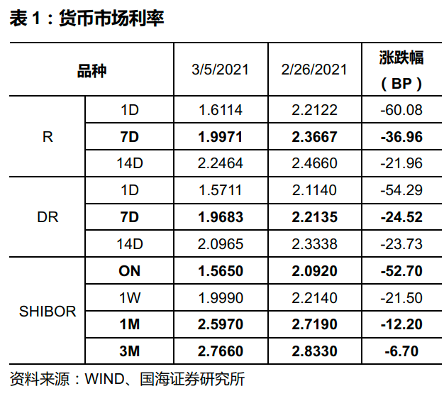 银行间资金利率一致下行。3 月 5 日,相较于上周五(2 月 26 日,下同),银行间质押式回购利率方面,R001 下行 60.08BP,R007 下行 36.96BP,R014 下行21.96BP。存款类质押式回购利率方面,DR001下行54.29BP,DR007下行24.52BP,DR014 下行 23.73BP。